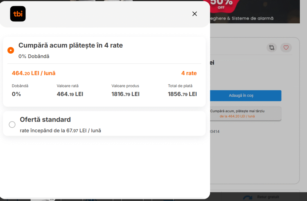 Te rugăm să consulți condițiile actualizate pentru plata în rate în pagina dedicată sau în coșul de cumpărături.