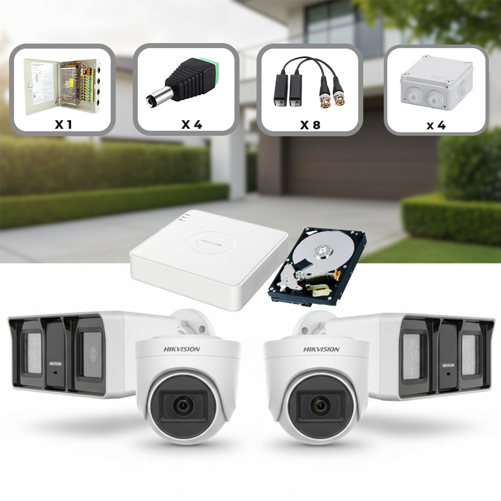 • Kit de supraveghere cu 2 camere de exterior analog Hikvision de 2MP