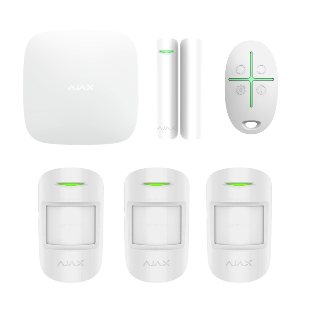 Acest pachet hardware este un sistem de securitate wireless conceput pentru a monitoriza patru puncte de detecție într-o locuință sau un spațiu comercial. Kit-ul include unitatea centrală Ajax Hub și un mix de patru senzori wireless, toate componentele fiind finisate în alb mat pentru o integrare discretă pe pereți sau tâmplărie PVC. Comunicarea între dispozitive se realizează prin protocolul radio Jeweller, care permite o rază de acoperire de până la 2000 de metri în câmp deschis, asigurând o conexiune stabilă fără necesitatea cablării.
