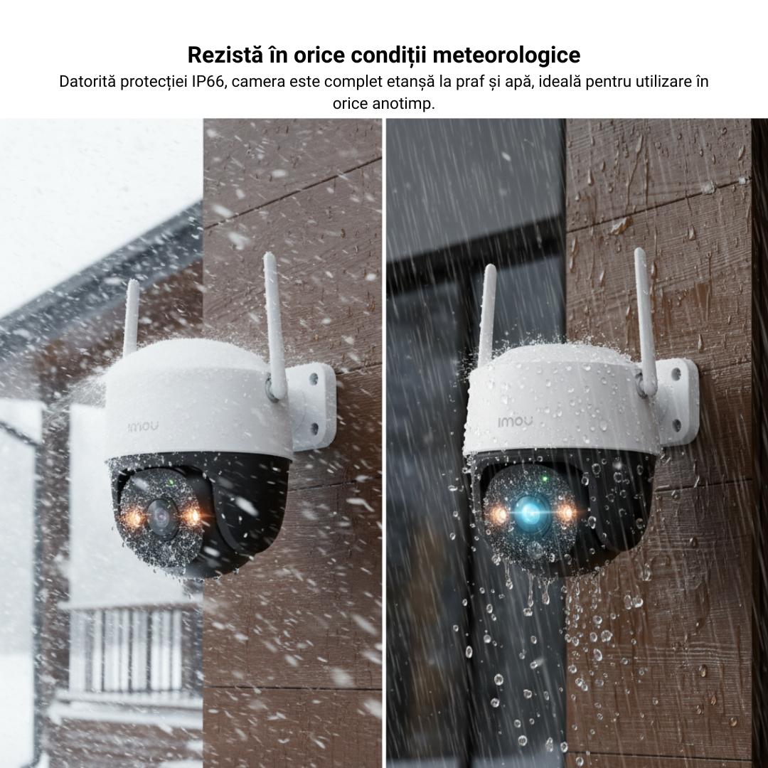 IMOU Cruiser SE+ are o certificare de protecție IP66, fiind proiectată să reziste la condiții meteo dificile, cum ar fi ploi torențiale, praf sau temperaturi extreme. Conectivitatea este simplificată prin antenele Wi-Fi externe de mare putere care asigură un semnal stabil pe distanțe lungi. Configurarea se face rapid prin aplicația IMOU Life (disponibilă pe iOS și Android), prin simpla scanare a codului QR de pe carcasă, oferindu-vă acces instant la imagini de oriunde din lume.