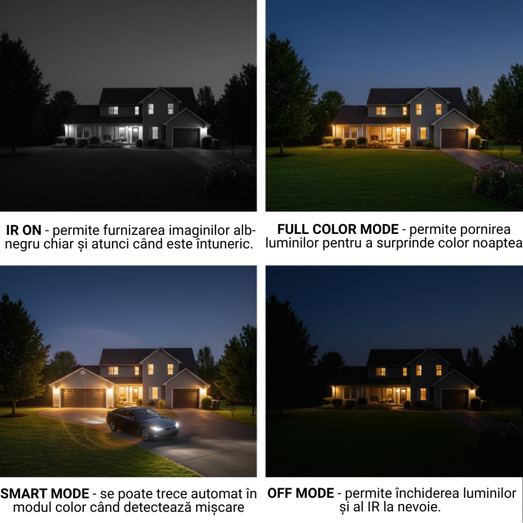 Spre deosebire de camerele convenționale care oferă doar imagini alb-negru noaptea, Cruiser SE+ 5MP dispune de patru moduri inteligente de iluminare. Puteți alege modul „Full Color” pentru a menține LED-urile albe aprinse, obținând imagini color clare, sau modul „Smart”, în care camera stă în infraroșu și aprinde reflectorul automat doar când detectează o persoană. Rezoluția de 5MP asigură că detaliile rămân extrem de fine chiar și în aceste condiții de lumină scăzută.